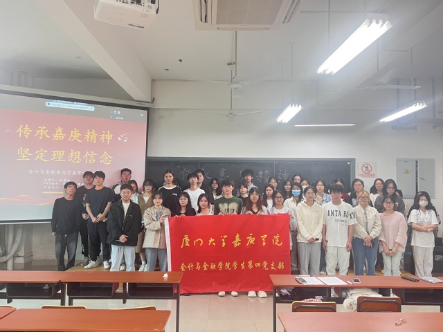 今年适逢校主陈嘉庚先生诞辰150周年之际,为进一步传承和弘扬嘉庚精神的时代内涵,激发党支部各成员爱国爱党爱乡的热情,加强理论知识学习,厦门大学嘉庚学院会计与金融学院学生第四党支部于2024年4月25日12时30分在经管大楼#212组织开展了“固定党日+传承嘉庚精神,坚定理想信念”主题活动。本次活动由入党积极分子刘晨源主持,学生第四党支部全体党员、预备党员及入党积极分子积极参与,共同追寻嘉庚先生的光辉足迹,深入理解和传承嘉庚精神。