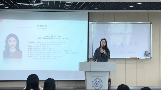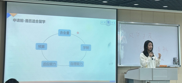 随后,深耕于留学教育领域11年之久的牟振华学姐分享了留学申请的注意事项。她指出要重视自己的核心竞争力,比如在校的学习均分、在校实习实践经历以及雅思成绩等。之后她分析不同留学国家以及地区的留学体制,教学质量等留学考量因素,为同学们选择未来留学之路指点迷津。她还分享了多位学长学姐的成功案例,鼓励有留学意向的同学积极行动,早日收获心仪的留学offer。