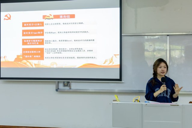 随后,主持人周奕君详细介绍了支部的组织架构与职责分工,通过系统全面的讲解,帮助新成员深化对支部运行机制的认识,明晰自身在支部建设中的角色定位,为他们更好地融入支部集体、投身支部工作筑牢坚实根基。